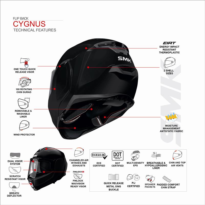 Introducing the SMK Cygnus, our latest flip-back helmet built for riders who demand versatility, comfort, and safety. Double P/J certified, it meets the highest standards for both full-face and open-face use. The 180° rotating chin guard allows effortless switching between styles, while the wide anti-scratch visor, Pinlock® MaxVision ready shield, and internal sun visor ensure clear vision in all conditions. Multi-density EPS and advanced airflow channels deliver superior impact absorption and ventilation, complemented by a removable hypoallergenic liner and speaker pockets. Safety features include an emergency release system and full-metal buckle, making the Cygnus ideal for touring or daily commuting.
